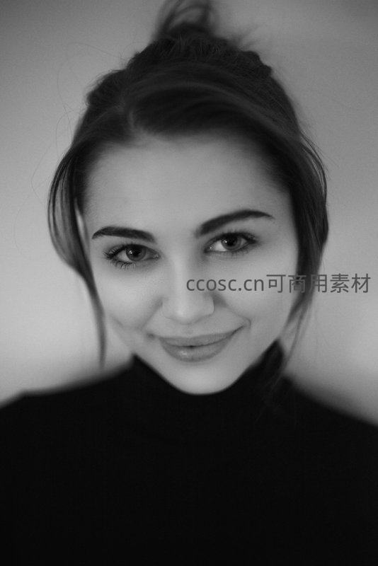 女子面带温柔微笑,高盘发髻整洁利落,眼神清澈明亮。黑白光影勾勒面部线条,凸显其自然美与从容气质。