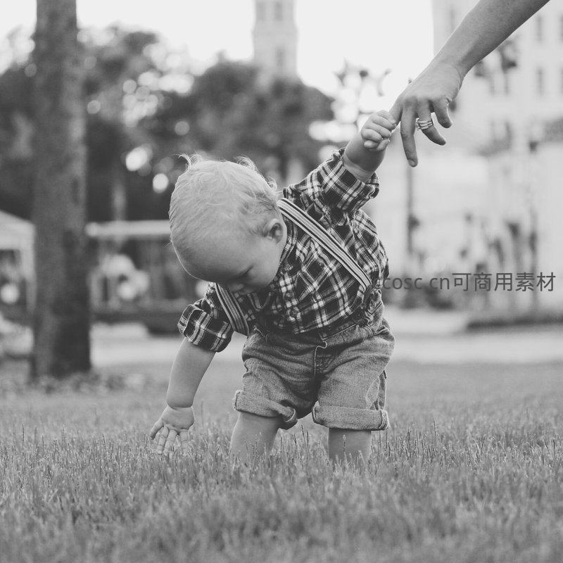 一个穿着格子衬衫和背带裤的幼儿正在草地上努力迈出第一步,大人的手轻轻牵着他的小手,给予支持与鼓励,画面充满温馨与成长的喜悦。