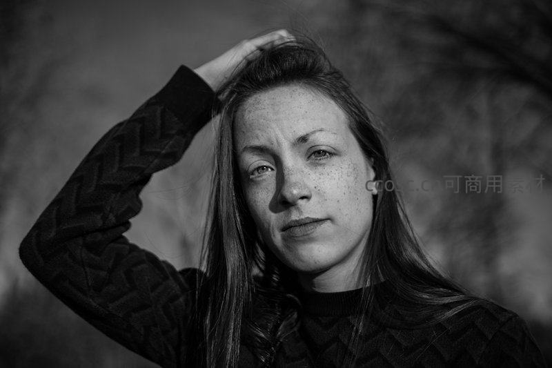 一位长发女性直视镜头,一手轻抚头顶,脸上雀斑清晰可见,柔和光影勾勒出她沉静而富有故事感的表情。