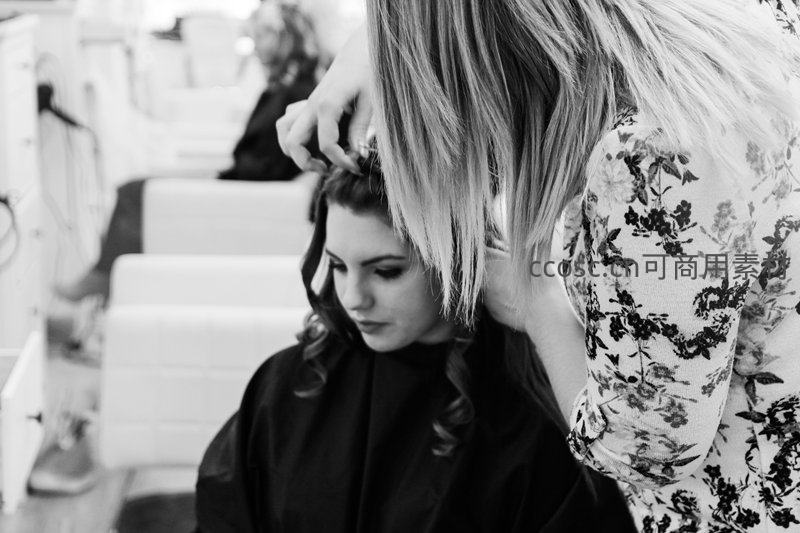 发型师为顾客精心打理卷发的黑白瞬间