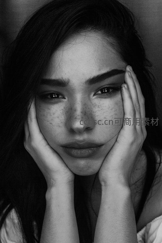 黑白特写中,一位满脸雀斑的少女双手轻托脸颊,眼神直视镜头,表情沉静而富有故事感,展现自然真实的美与情绪张力。