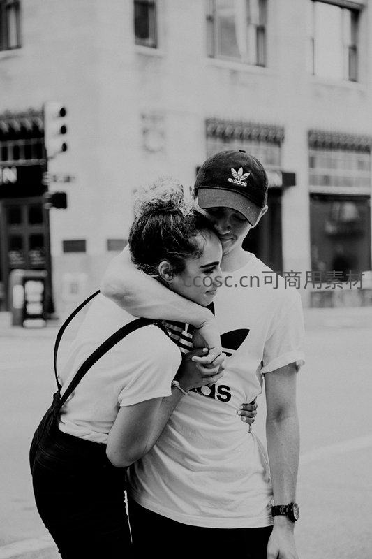 街头情侣温馨拥抱黑白瞬间