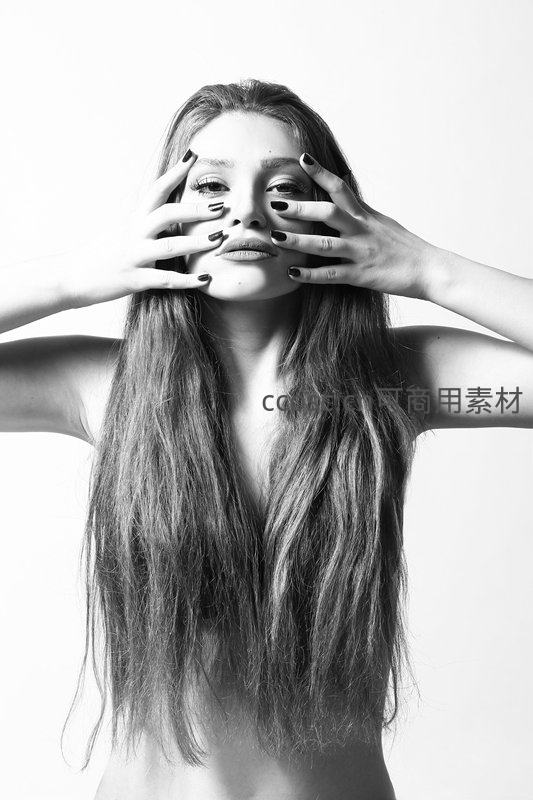 女子用双手轻覆面部,仅露出嘴唇与部分眼眸,长发垂落,极简背景凸显其情绪表达与艺术张力。