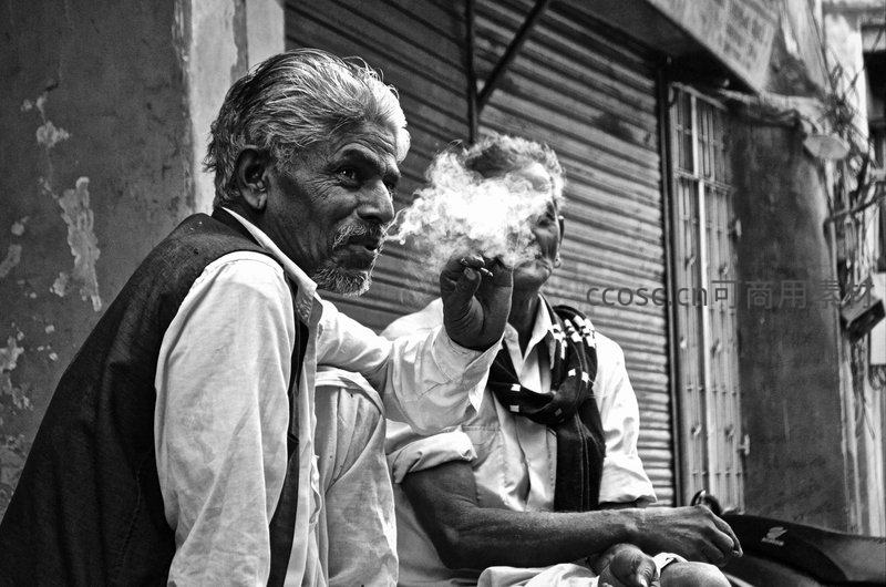 街头老者烟雾缭绕的沉思瞬间