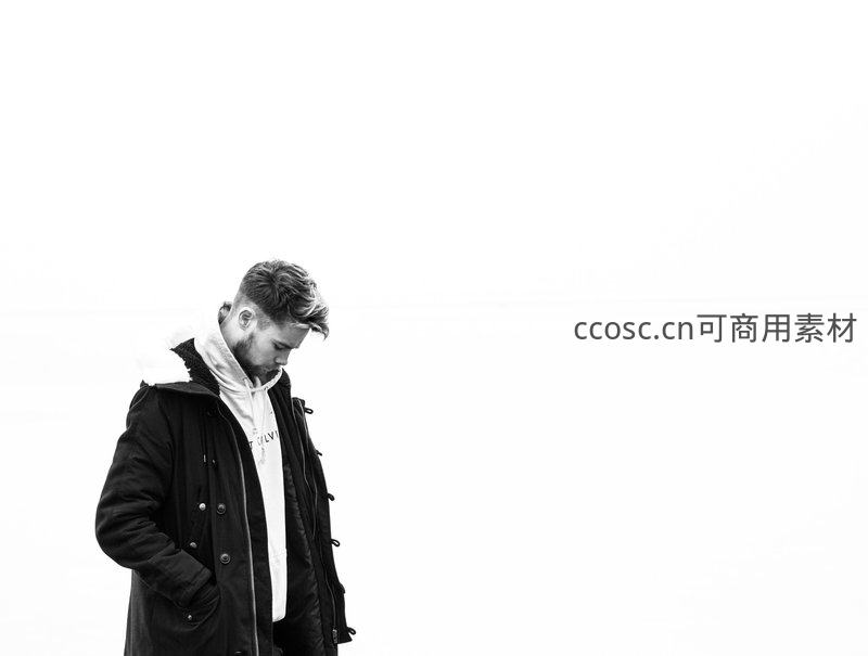 一名男子身穿厚实外套伫立在纯白雪景中,低头若有所思,极简构图与高对比度突出其内心的宁静与孤寂感。