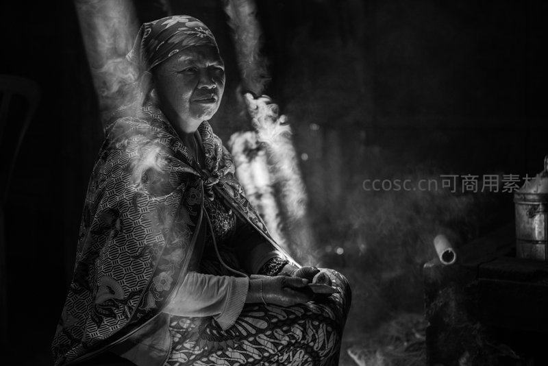 一位裹着头巾的老妇人在厨房烟火中静坐,烟雾弥漫,面容宁静,传递出浓厚的生活气息与人文温度。