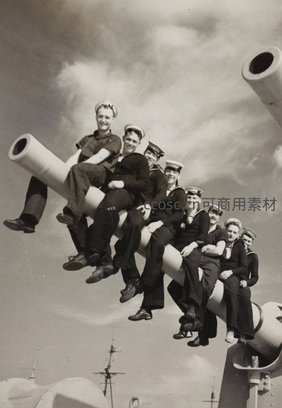 一群身着制服的水兵轻松地坐在战舰主炮炮管上合影,天空云层密布,展现出战争年代中难得的轻松与战友情谊。