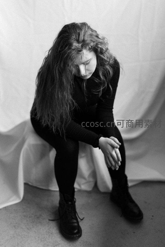 一位長髮少女身著黑色服裝,低頭靜坐於純白背景前,神情落寞,營造出深沉內省與孤獨感。