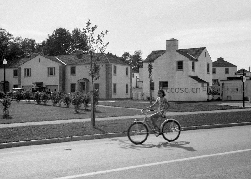 一名少女骑着自行车穿过安静的郊区住宅街道,两旁是整齐的房屋和绿树,画面弥漫着上世纪中叶的宁静生活气息。