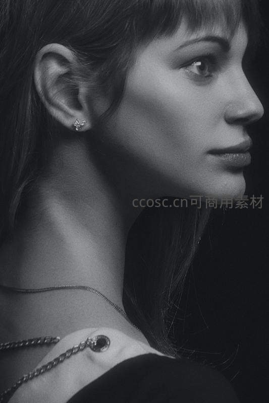 以侧面视角捕捉女性颈部线条与耳饰细节,黑白影调突出质感,营造静谧而高贵的视觉氛围。