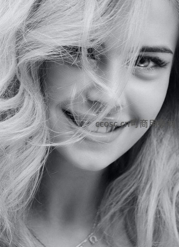 一位金发女子在柔和的黑白光影中绽放灿烂笑容,发丝轻拂面颊,眼神明亮动人,展现出纯粹而自然的美丽与活力。