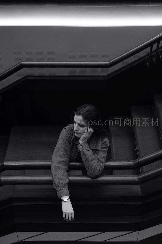 女子坐在现代感楼梯上托腮沉思,几何线条与柔和光线营造出安静、内省的空间氛围。