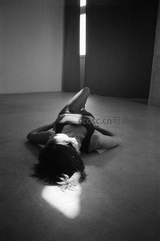 人物仰卧于空旷室内地面,一束自然光从高窗洒落,在身体与地板上形成强烈明暗对比,营造出宁静又充满张力的视觉艺术效果。