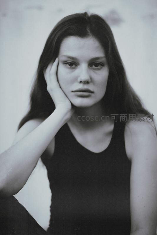 一位年轻女性在黑白光影中静坐,手轻托脸颊,眼神深邃而内敛,展现出一种安静的忧郁与艺术感。