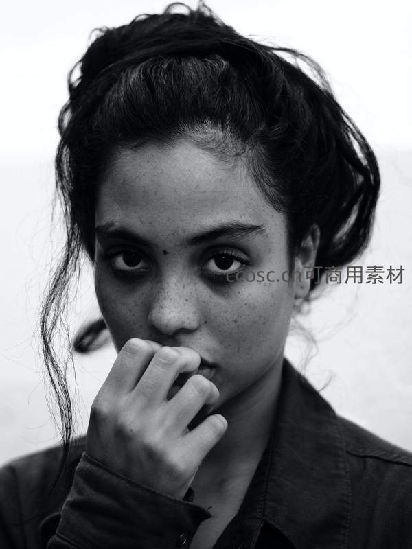 一位拥有雀斑的年轻女性,眼神深邃而专注,手指轻触唇边,流露出沉静思考的神情,黑白影调突显其面部纹理与真实感。