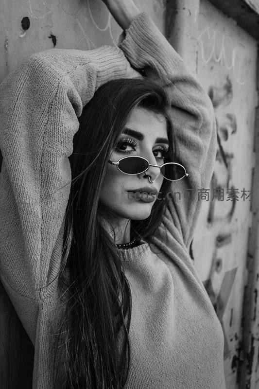女子佩戴复古墨镜倚靠斑驳墙面,长发垂肩,姿态慵懒而有型,黑白调强化了画面的艺术感和情绪张力。