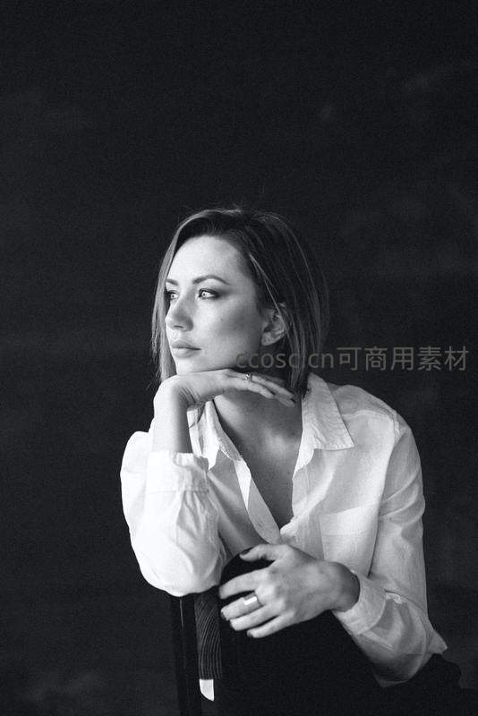 一位女性在深色背景下托腮凝望,神情专注而宁静,白色衬衫与暗调背景形成强烈对比,营造出经典而富有艺术感的视觉氛围。