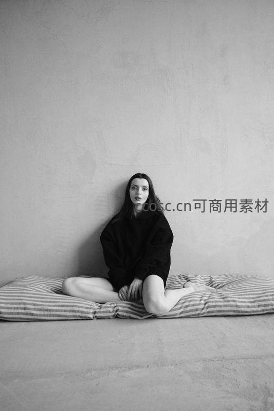 一位年轻女子身穿黑色宽松毛衣,盘腿坐在条纹垫子上,背靠素净墙面,眼神直视镜头,画面干净简洁,传达出宁静、内省与自在的生活状态。