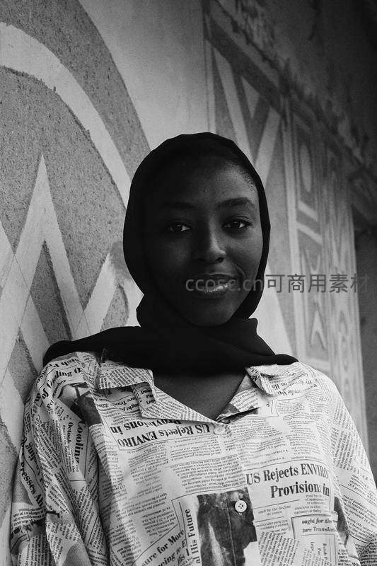 一位戴着黑色头巾的女性身穿印有英文新闻标题的衬衫,倚靠在几何图案墙边,笑容温暖而自信。