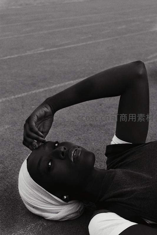 一名黑人女性头戴白色头巾,仰卧在跑道上,手轻触额头,神情宁静,展现运动后的休憩与沉思瞬间。