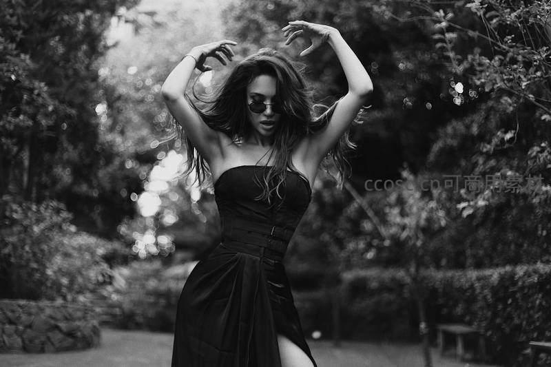 花园中舞动的黑裙女子