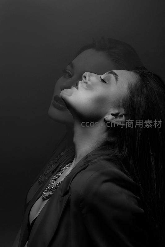 通过双重曝光技巧,女性侧脸形成重叠影像,闭目仰首,颈间项链闪烁微光,营造出超现实、梦幻且富有哲思的视觉效果。
