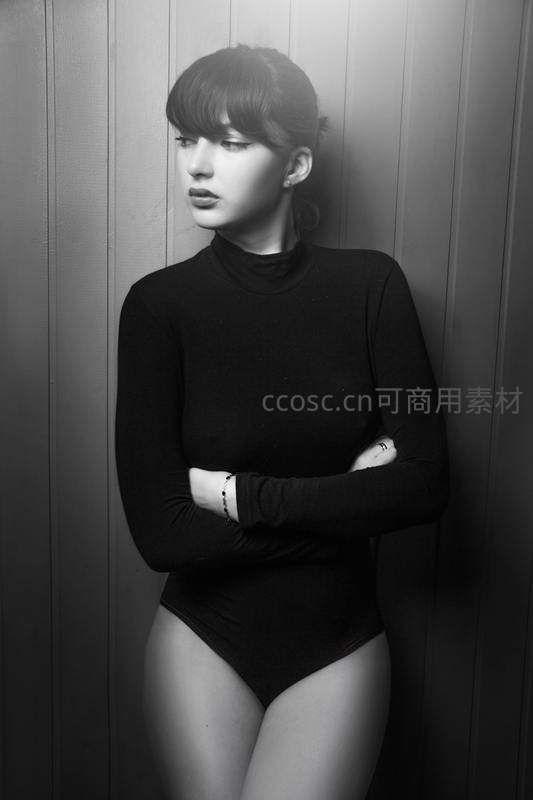 一位身着黑色高领紧身衣的女性,倚靠在木质墙板前,双臂交叉,神情沉静。黑白影调突出其轮廓与情绪,营造出高级感与艺术氛围。
