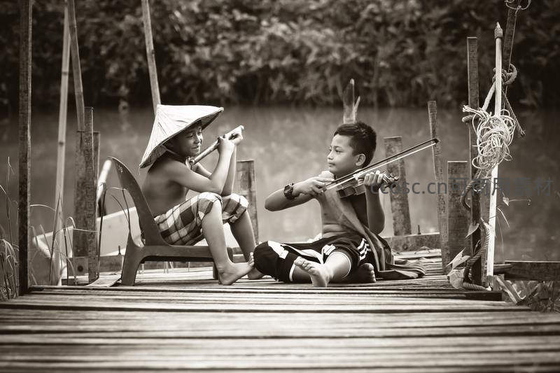 两个男孩在湖边木台上,一个吹笛一个拉琴,黑白影像定格了纯真岁月与悠扬旋律,背景绿意盎然,充满宁静与欢乐。