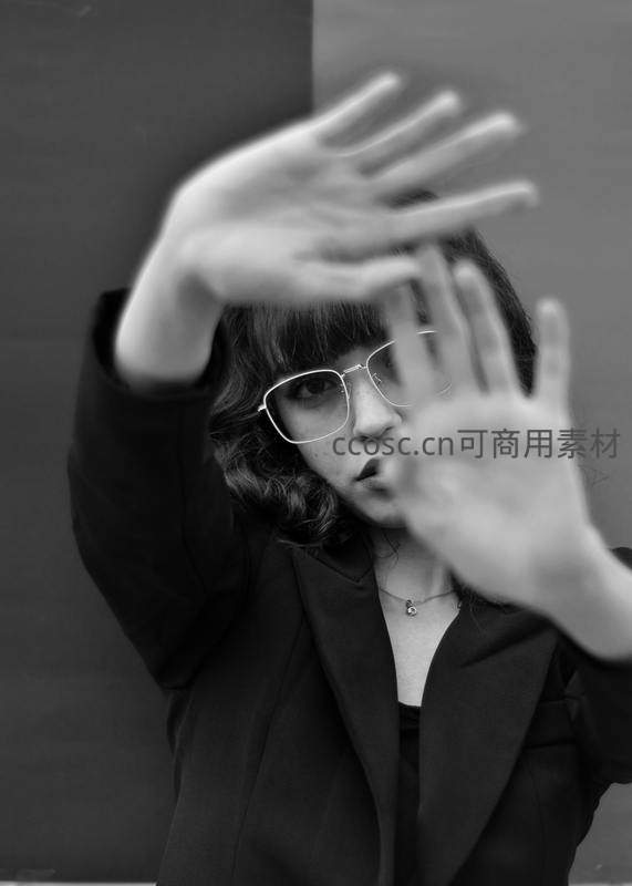 一位戴眼镜的年轻女子用双手在面前比划出框架,目光直视镜头,黑色西装与简约背景形成对比,营造出前卫而神秘的氛围。