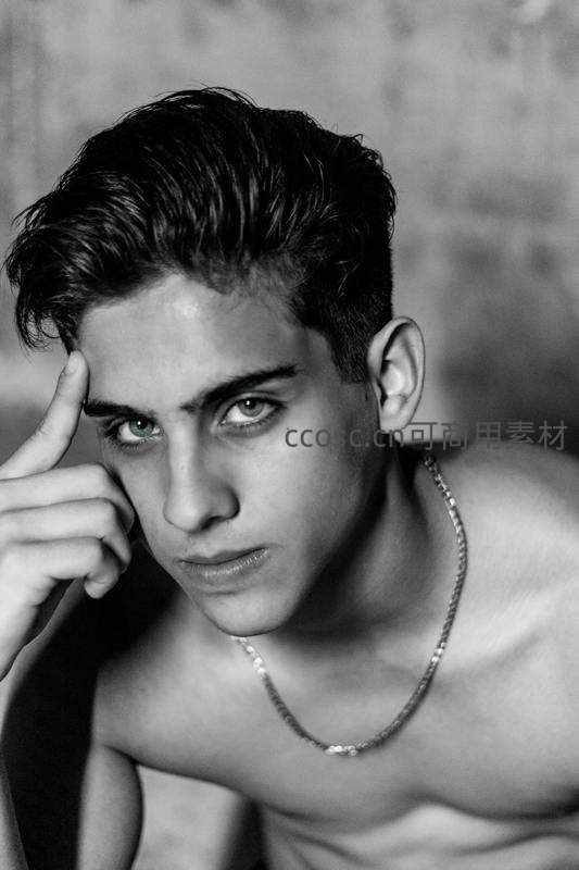 赤裸上身的少年佩戴银色项链,手指轻触额头,清澈的绿色眼眸在黑白影调中格外突出,展现青春与时尚感。