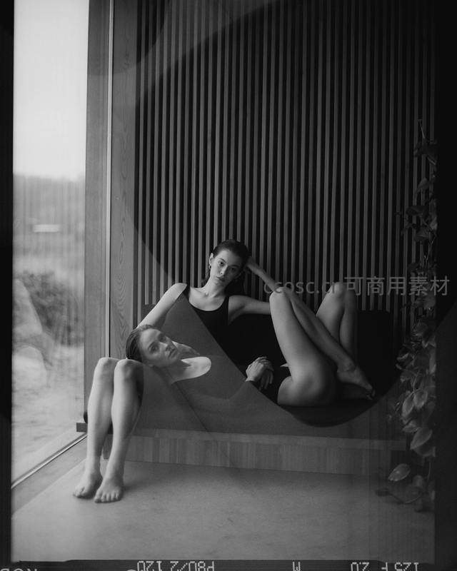 两位女性在木质背景与窗边的柔和光线下,以自然放松的姿态展现身体线条与情感张力,营造出静谧而富有艺术感的氛围。