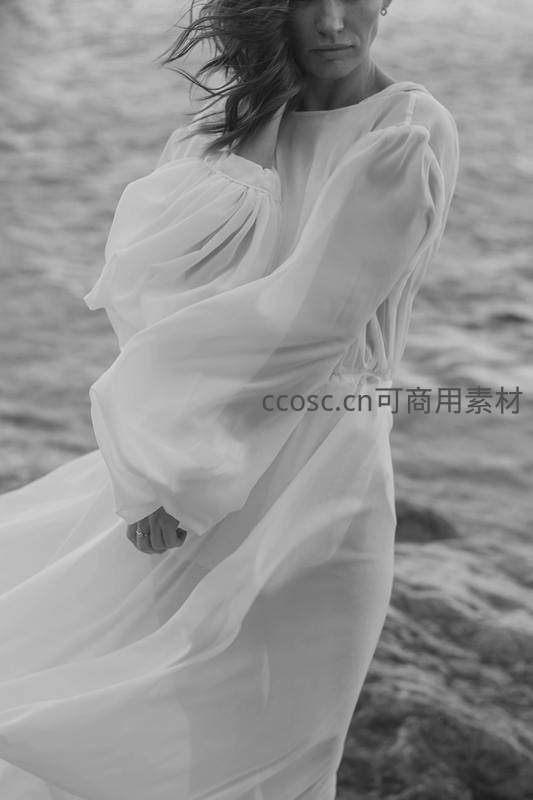 一位女子身着飘逸白裙立于海边,海风扬起裙摆与发丝,黑白影调渲染出静谧而富有诗意的氛围,尽显自然与人文的和谐之美。