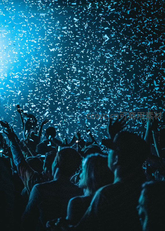 在蓝色激光灯照射下,漫天飞舞的彩带与欢呼的人群交织成一片沸腾的海洋,营造出激情四射、无拘无束的狂欢氛围。
