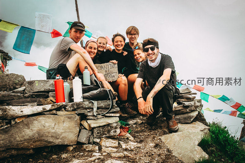 一群登山者在云雾缭绕的山顶石墙旁合影,手持海拔标牌,脸上洋溢胜利喜悦,彩色经幡随风飘扬。