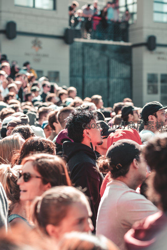 大量人群在户外活动现场聚集,享受阳光下的热闹氛围,背景建筑与人群形成鲜明对比。