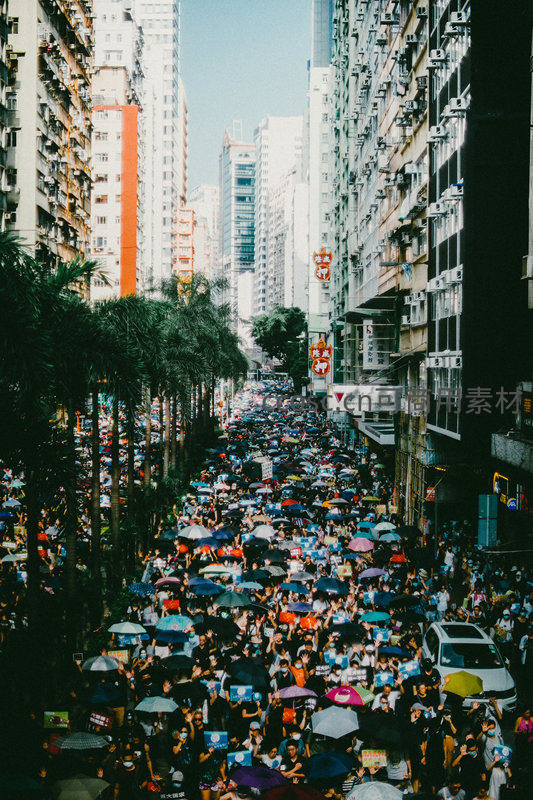 密集人群撑伞游行于高楼林立的城市街道