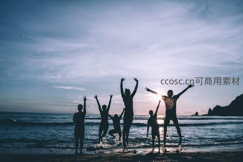 夕阳海滩剪影欢呼跳跃