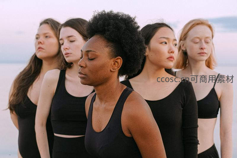 五位来自不同背景的女性身着黑色上衣,在海边并排静立,闭目沉思或凝视远方,柔和光线勾勒出她们的轮廓,传递出内省与力量感。