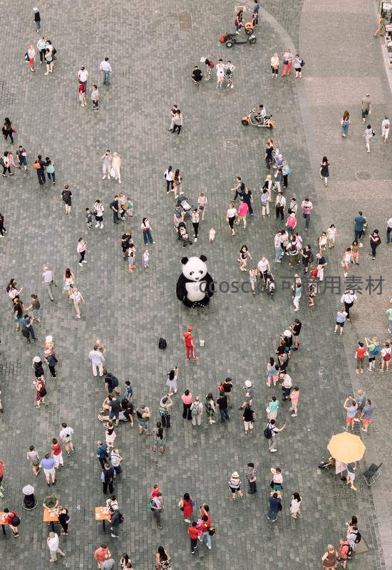 广场俯瞰视角,熊猫玩偶与人群构成趣味画面