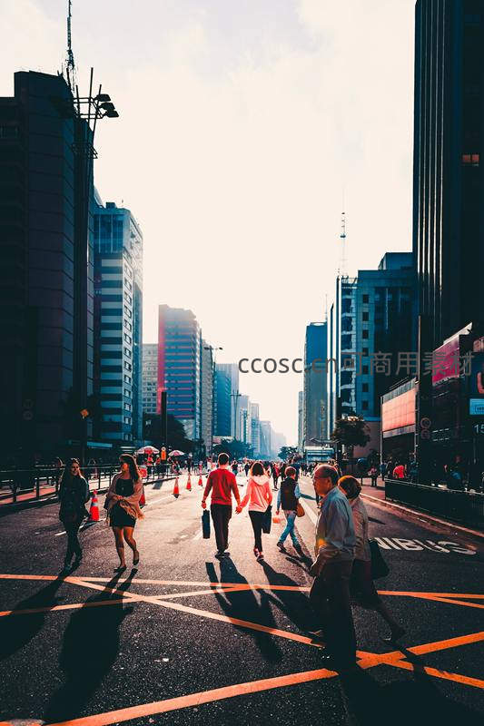 在明媚阳光下,行人穿梭于摩天大楼间的宽阔街道,橙色标线与长长人影交织,展现都市活力与现代建筑美学。