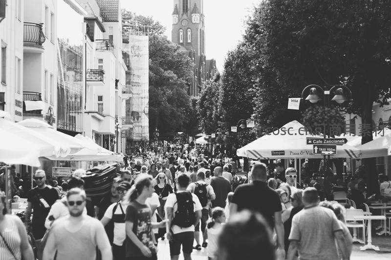 黑白街景中人群熙攘的欧洲步行街