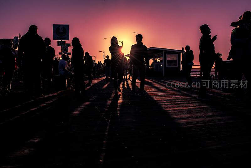 夕阳西下,金色余晖穿透云层,码头上的人群化作黑色剪影,悠然漫步或驻足观赏,尽享宁静浪漫的黄昏时光。