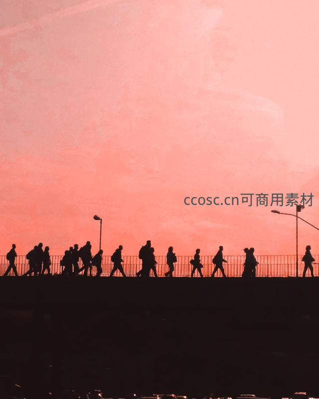粉红色的晚霞映衬着桥上匆匆而过的行人剪影,宁静与动感交织,构成一幅充满诗意的城市黄昏画卷。