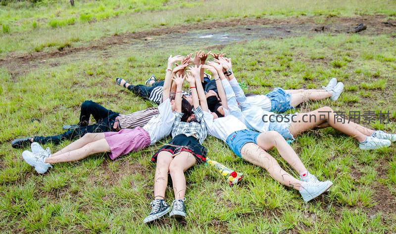一群年轻人躺在绿茵草地上,手拉手围成一个圆圈,用创意手势摆拍,洋溢着无忧无虑的青春气息。