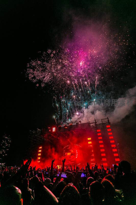 绚丽烟花在音乐节夜空绽放,红色舞台灯光映照着欢呼的人群,营造出盛大庆典般的梦幻与激情时刻。