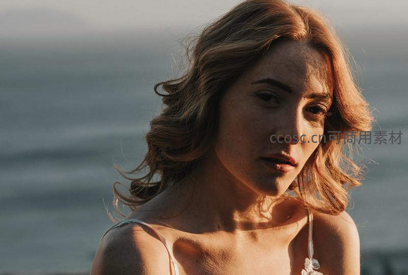 一位金发女子在海边沐浴着温暖的夕阳,眼神深邃而宁静,微风轻拂她的卷发,营造出一种沉思与浪漫交织的氛围。