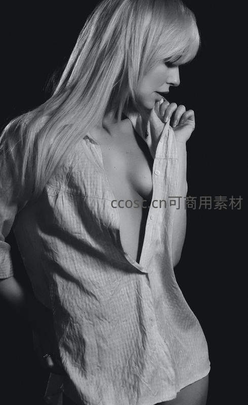 在纯黑背景下,一位金发女子身穿宽松白衬衫,侧身站立,手指轻触唇边,强烈的明暗对比突显其优雅轮廓与沉思神态。