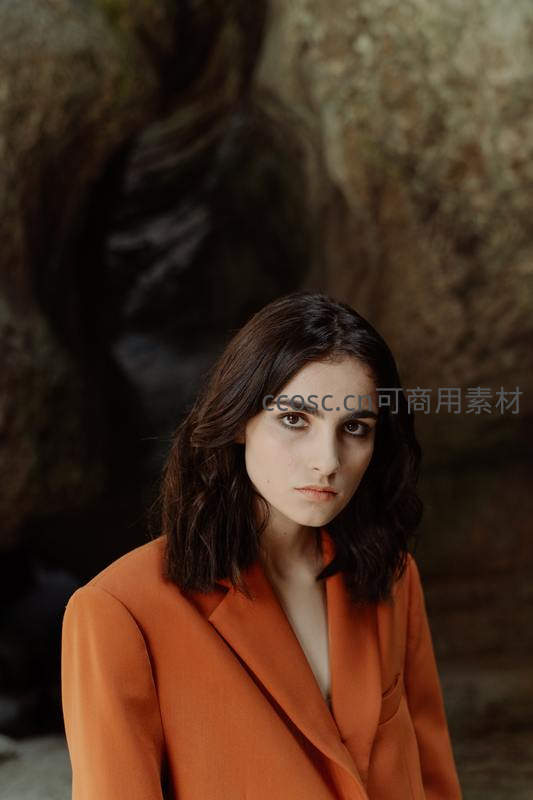 身穿亮橙色西装的女性在粗犷岩石背景前直视镜头,神情沉静冷峻,深色卷发与暖色衣装形成对比,凸显个性与力量感。