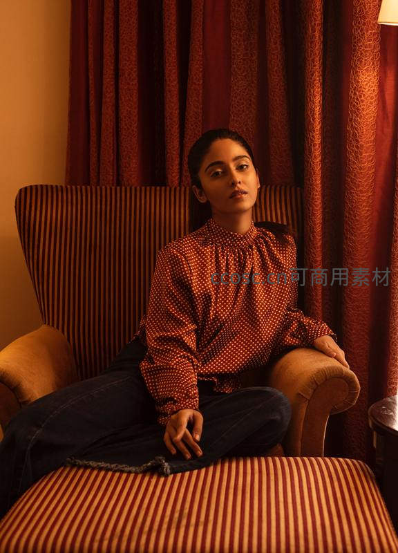 女子身穿红底白波点衬衫,盘腿坐在复古条纹沙发上,背景是厚重窗帘与暖黄灯光,整体色调温暖浓郁,散发怀旧舒适的生活感。