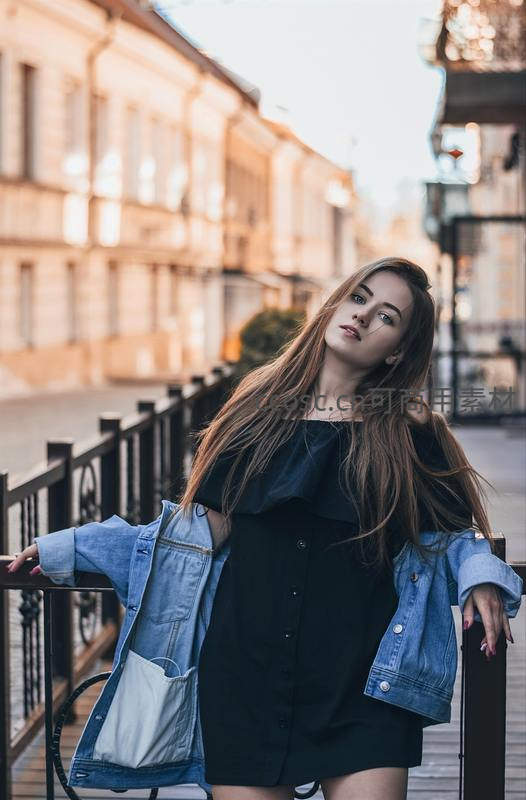 一位长发女子倚靠在城市街道的栏杆旁,身着黑色连衣裙外搭牛仔外套,背景是暖色调的老式建筑,展现出都市时尚与悠闲的生活气息。